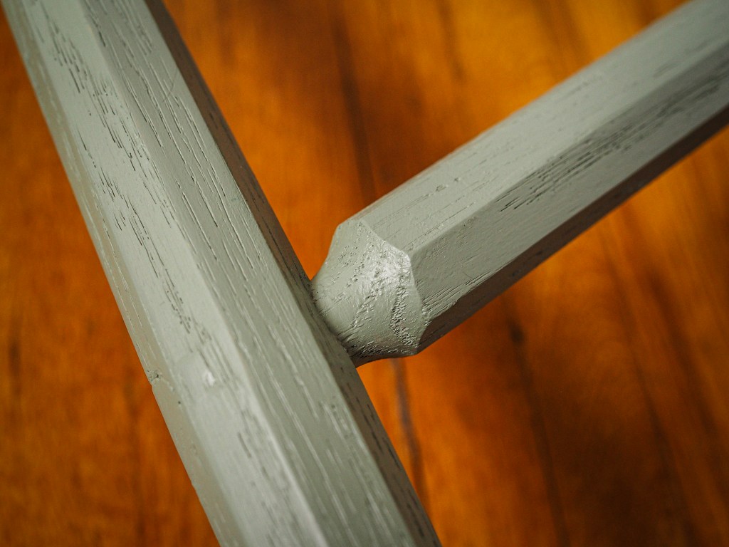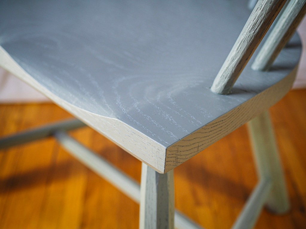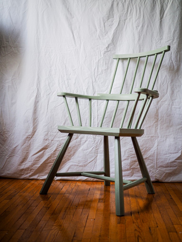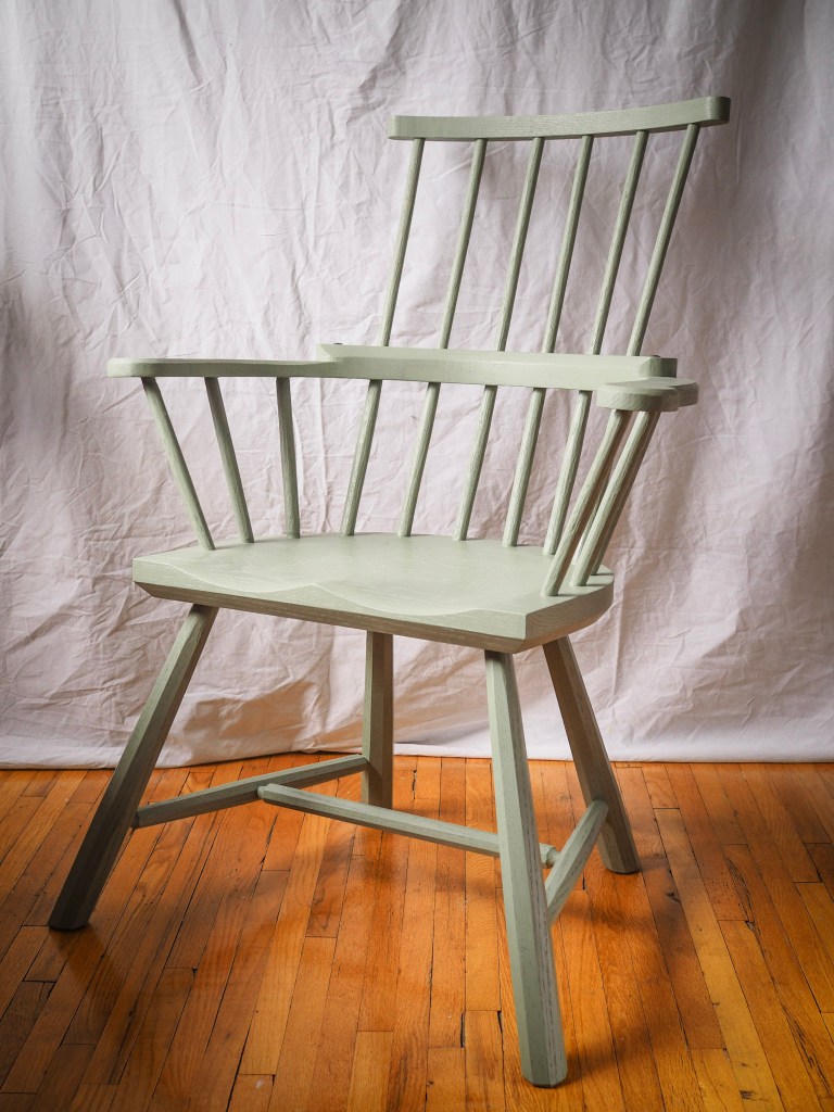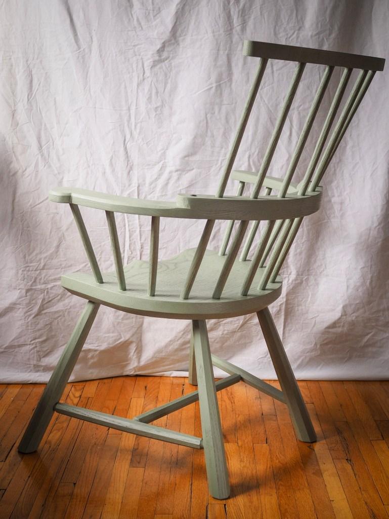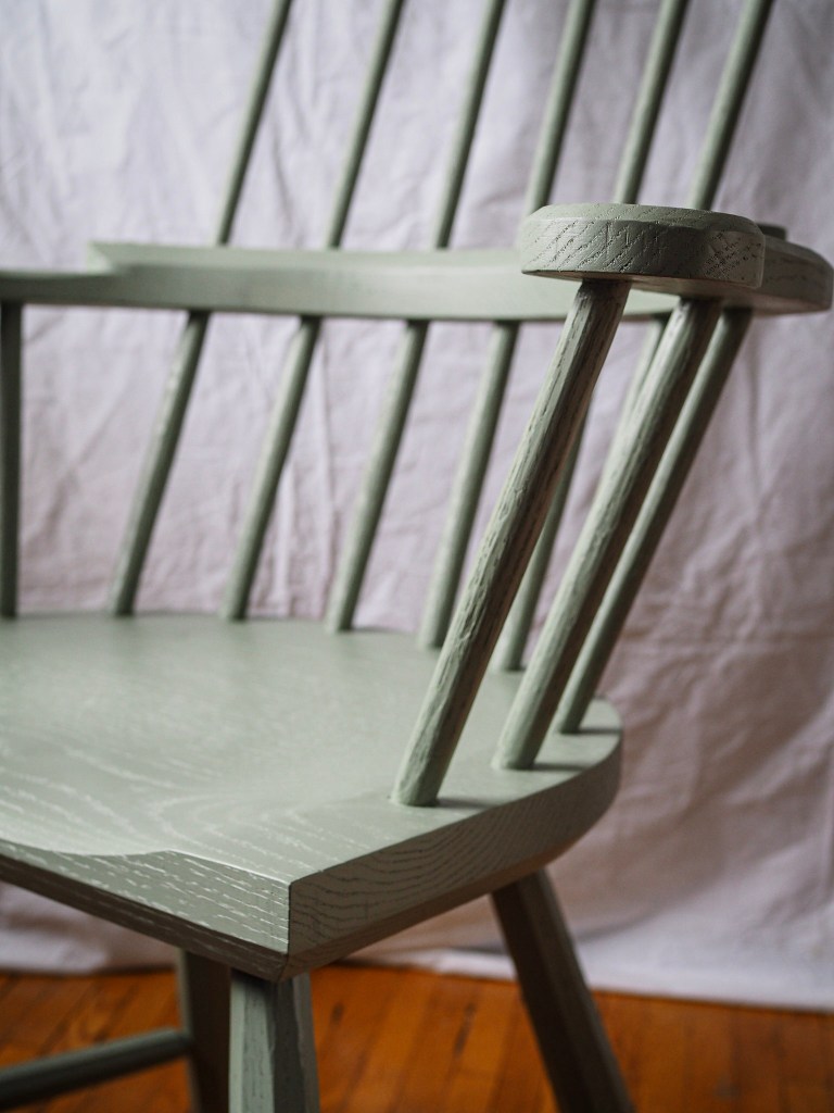 This Welsh-inspired combback stick chair is based on a Christopher Schwarz design and features gently curving arms and a relaxed pitch that feels welcoming and comfortable. It’s painted with General Finishes Basil acrylic milk paint, which has a beautiful matte finish that still shows the grain of the wood. Another detail is the two forged nails in armbow (more for decoration than strength).