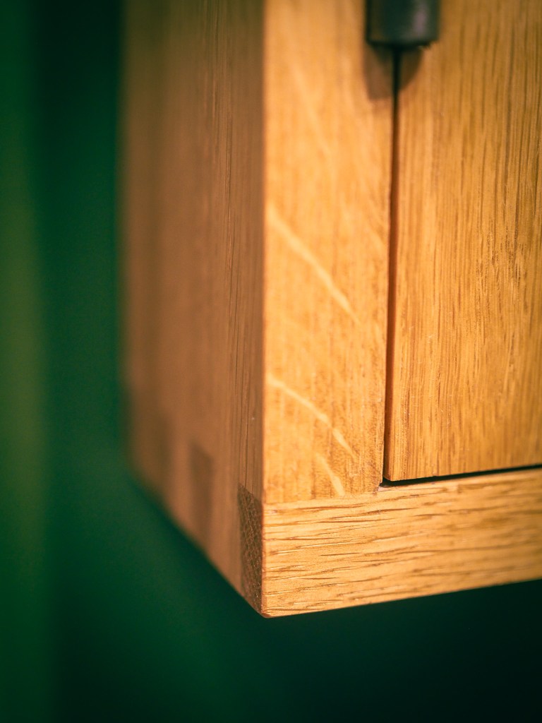 This medicine cabinet is built from white oak, with dovetailed corners and cast-iron hardware from Spearhead & Company. I left the back open so that the wall colour would show through.