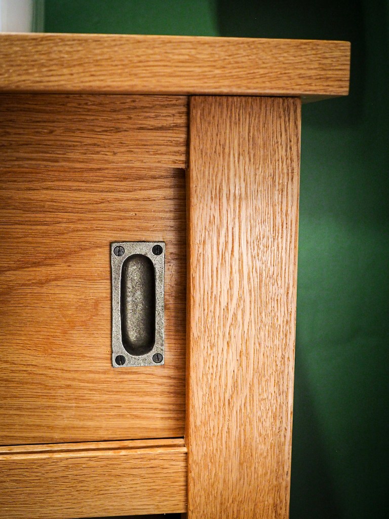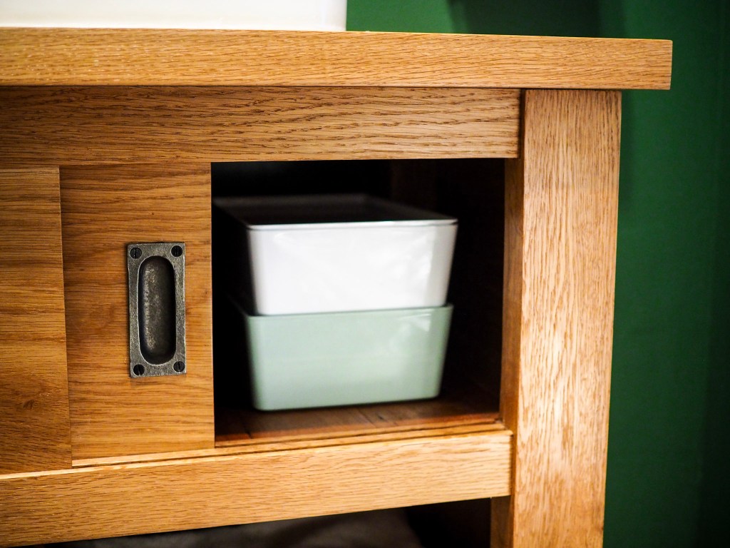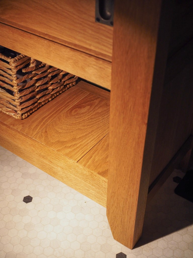 This vanity is built from solid white oak, with strong mortise-and-tenon joinery throughout. The doors feature cast iron pulls and slide smoothly in wooden grooves but can easily be removed if needed. The bottom shelf is open in the back and is perfect for towels or baskets.